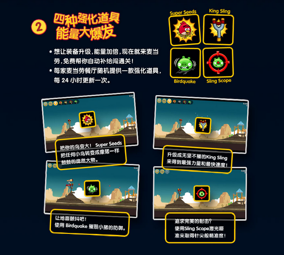 En effet, quatre nouveaux niveaux ont été spécialement développés pour les besoins de cette opération. Ainsi, les clients des 1.500 restaurants participants ont le privilège de pouvoir télécharger ces niveaux exclusifs ainsi que de nouveaux bonus.