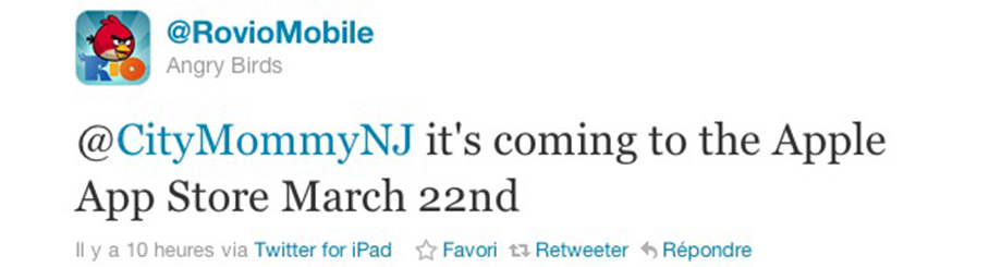Rovio n’en fini plus de teaser au sujet du lancement du prochain épisode de son Best Seller «Angry Birds». Distribué exclusivement via l’Amazon App Store pour les gamers sous Android et bien évidemment via l’iTunes App Store pour les possesseurs d’iPhone, iPod Touch et iPad, «Angry Birds Rio» sera disponible dès le 22 mars prochain.
