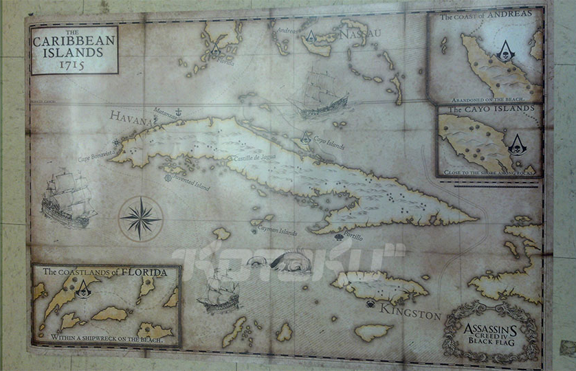 Je profite de cet article pour vous glisser une première capture d’écran supposément tirée du jeu ainsi qu’une carte qui nous indique qu’Assassin’s Creed 4 dont l’action se déroulera en l’an 1715 nous invitera à naviguer sur les mers des Caraïbes… Notez enfin qu’il se murmure que l’assassin Edward Kenway qui n’est autre que le père de Haytham Kenway lui même géniteur de Connor Kenway serait le personnage central d’AC4.