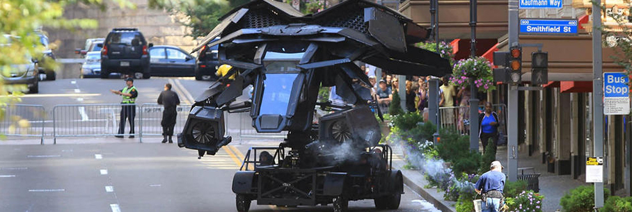 Aperçu dans les rues de Pittsburgh ou se poursuit le tournage du prochain volet des aventures de l’homme chauve-souris et après les Tumblers version camouflage et la moto de Catwoman, voici un incroyable nouveau véhicule qui fera sa première apparition dans le très attendu «The Dark Knight Rises».