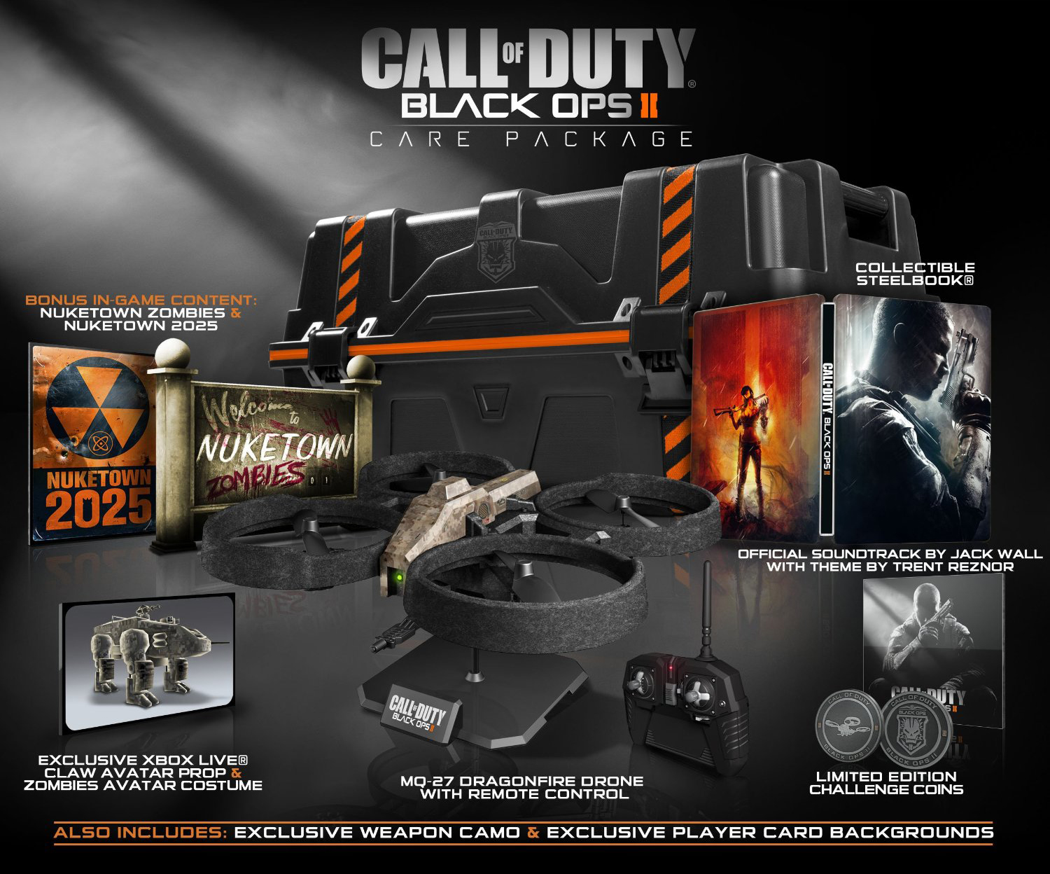 Le bien nommé coffret «Care Package» se présentant sous la forme d’un colis stratégique comprend pour sa part une copie du jeu, les deux nouvelles versions de la carte Nuketown, la bande-son officielle du jeu, deux jetons de défis, un camouflage d’arme et des cartes d’agents exclusifs mais surtout, un véritable drone MQ-25 DragonFire télécommandé ! WAAANT!!!