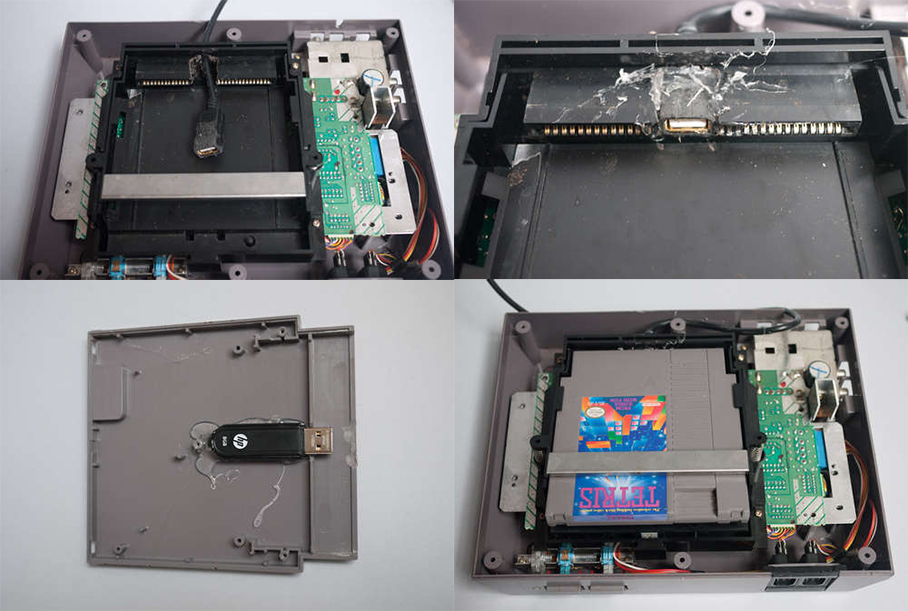 L’idée est toute bête: insérer un cable USB en lieu et place du port de connexion des cartouches de jeu de la console afin de pouvoir insérer dans le tiroir de la belle une cartouche originale dont les composants ont été remplacés par ceux d’une simple clé USB.