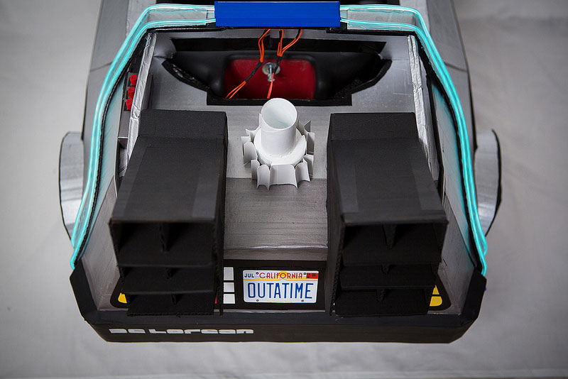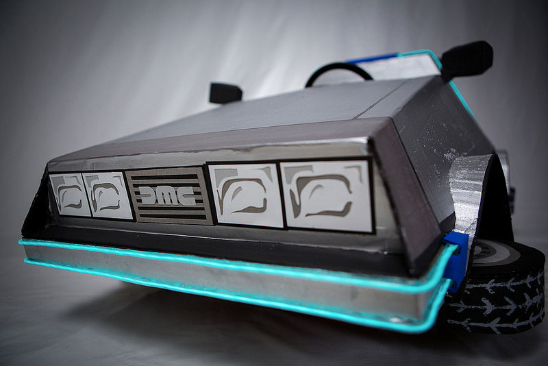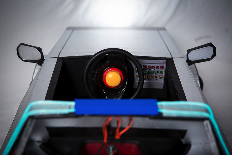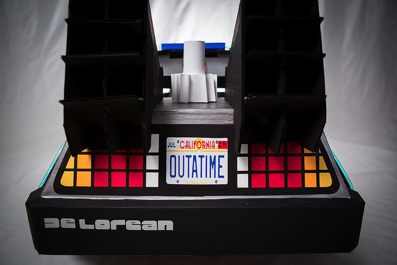 Sous cette superbe reproduction cartonnée de la fameuse voiture à voyager dans le temps se cache en réalité une banale voiturette-poussette pour bébé habilement transformée pour l’occasion. De quoi vous donner une bonne grosse envie de faire des gosses… ^^