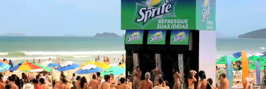 Un gigantesque distributeur de Sprite de 10m de haut faisant office de douches publiques planté au beau milieu d’une plage de la ville brésilienne de Rio de Janeiro, c’est l’excellente idée qu’ont eu les équipes de l’agence Ogilvy de Sao Paulo pour faire la promotion du rafraichissant soda. Sympa!