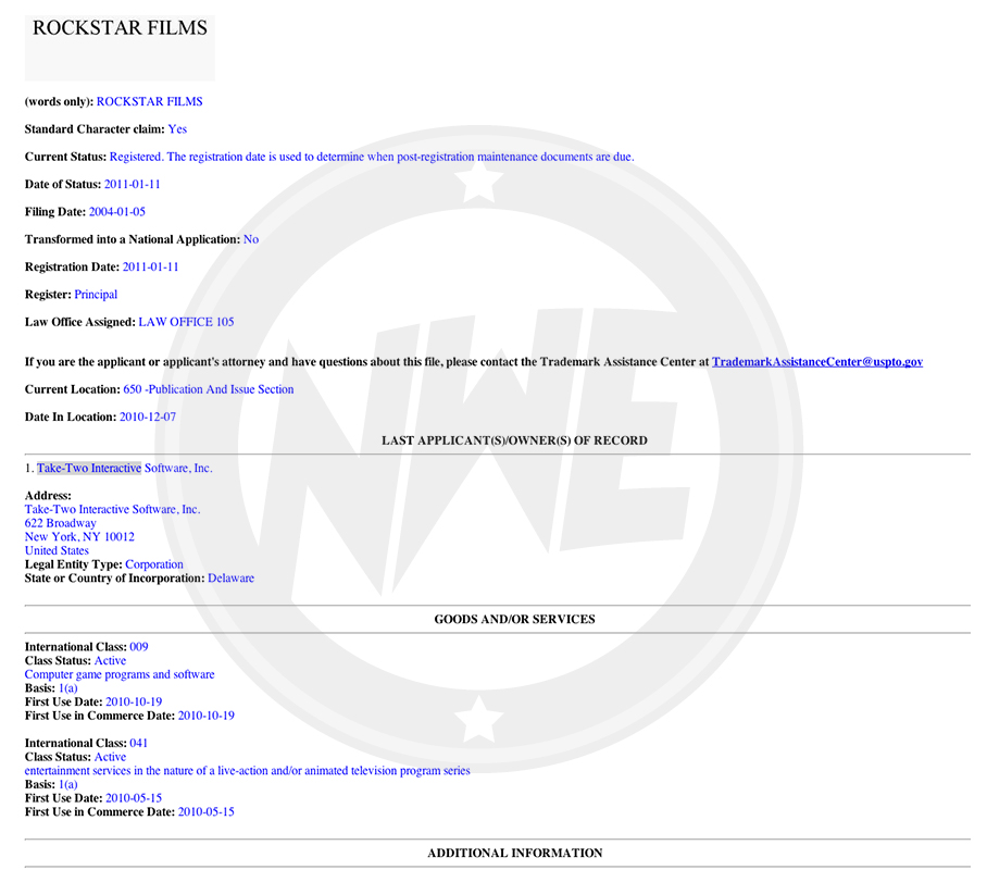 Initialement déposée en décembre 2010 auprès de l’United States Patents and Trademark Office (USPTO), la marque «Rockstar Films» qui ne laisse que peu de place aux doutes quant aux intentions de Rockstar/Take-Two a été approuvée en date du 14 juin dernier.
