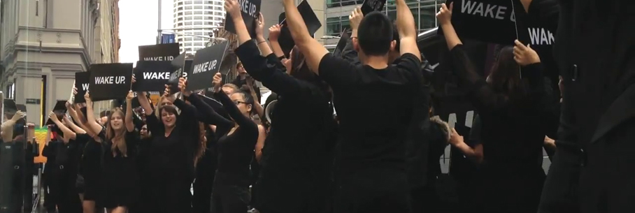 Un gros bus noir qui se gare en double file juste en face de l’Apple Store de Sydney afin d’y déposer plusieurs dizaines d’individus entièrement vêtus de noir et scandant pancartes en mains «WAKE UP!» soit «RÉVEILLEZ VOUS!», voici la dernière opération commando organisée par une agence de communication pour, semble-t-il, le compte de Samsung.