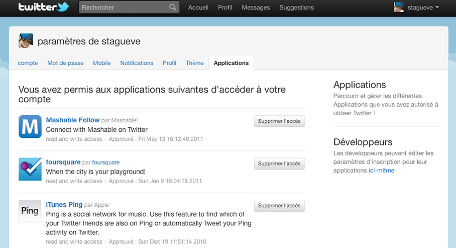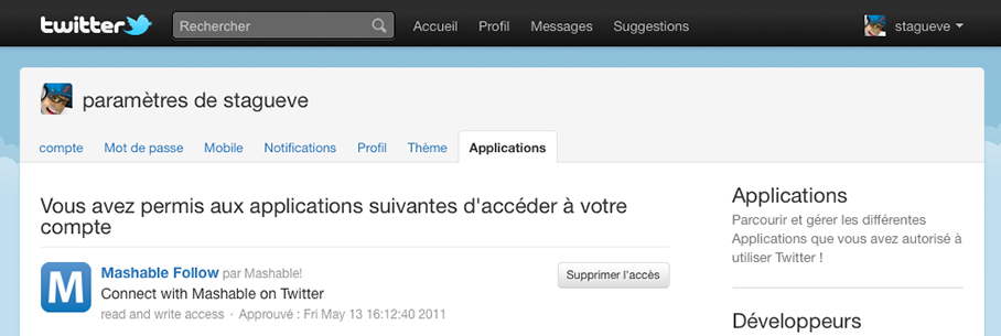 Tout comme le fait Facebook pour permettre à ses utilisateurs de gérer la multitude d’applications liées à leur compte, Twitter met un outil de gestion des applications tierces à votre disposition.