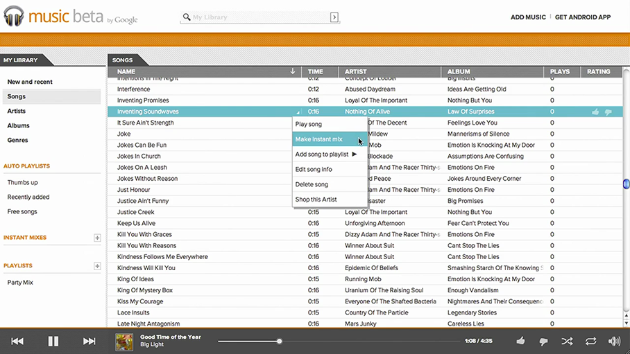 Dans un premier temps gratuit, cet espace vous permettra de stocker l’équivalent de 20.000 fichiers musicaux (je vous laisse faire le calcul concernant le volume), d’y accéder depuis n’importe quel ordinateur et périphérique Android (téléphones mobiles et tablettes) et ce que vous soyez connectés à Internet ou non.
