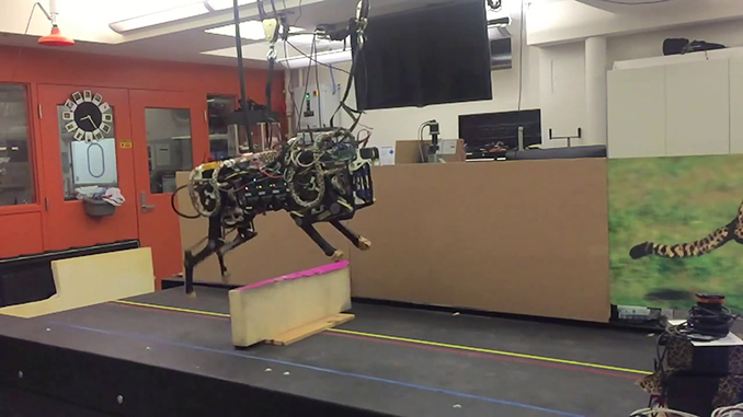 Les chercheurs du MIT viennent de publier une impressionnante nouvelle vidéo de démonstration de leur quadrupède robotisé baptisé Cheetah. Toujours plus performant, le fameux guépard mécanique qui peut sprinter à une vitesse moyenne de 45Km/h est désormais équipé de nouveaux capteurs qui lui permettent de détecter des obstacles d’une hauteur maximum de 40cm au dessus desquels il peut à présent sauter. De plus en plus flippant…
