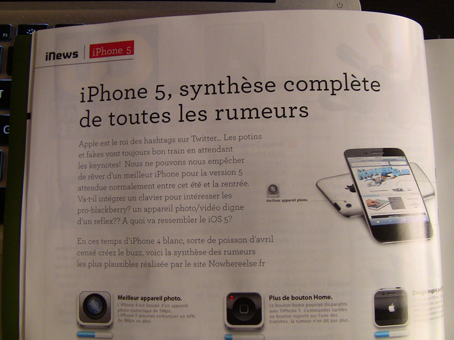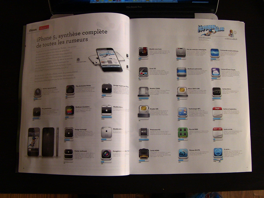 Dernier magazine Ć  avoir repris l’un de nos articles, le premier numĆ©ro du magazine Ā«iLiveĀ» disponible en kiosque depuis ce matin a consacrĆ© une double page Ć  l’iPhone 5, double page qui reprend ni plus ni moins que notre fameuse Infographie de rĆ©sumĆ© des rumeurs concernant l’iPhone 5 ou iPhone 4s (cliquez ICI pour dĆ©couvrir cette Infographie).