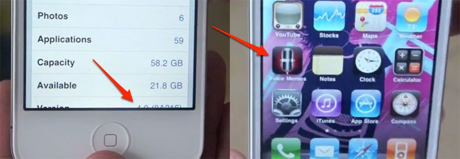 [MAJ] Dans la seconde vidéo on peut apercevoir brièvement mais clairement (à 1.35mn) qu’il s’agit en fait d’iOS 4.0 (à gauche sur l’image ci-dessous). De plus, l’icône du dictaphone n’est pas celle utilisée depuis iOS 4 mais celle utilisée dans les version précédentes (à droite sur l’image ci-dessous)… Ça sent donc la fausse alerte… [/MAJ]
