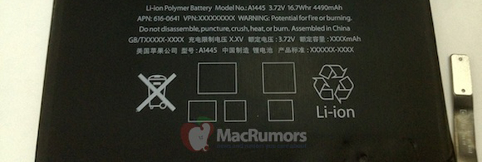 Identifiée sous les références A1445 (modèle) et 616-0641 (pièce), cette batterie dont le form-factor correspond à celui des composants utilisés par Apple dans l’ensemble de ses appareils aurait une puissance de 3.72V pour 16.7Wh et une capacité de charge de 4.490mAh contre 3.72V pour 42.5Wh et 11.560mAh pour la batterie de l’actuel iPad. Notez que certains bruits de couloirs annonçant que l’iPad Mini devrait uniquement être décliné dans une version Wifi (pas de 3G et encore moins de 4G), les caractéristiques cités plus haut à titre de comparaison sont celles de la batterie de l’iPad Wifi de troisième génération (référence A1389).