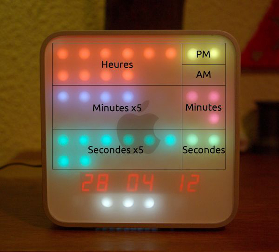 La lecture de l’heure délivrée par une horloge externe se fait via une matrice constituée de 8×6 LEDs colorées. La date est pour sa part affichée dans un mode de lecture plus traditionnel soit par une barrette de chiffres. Sympa!