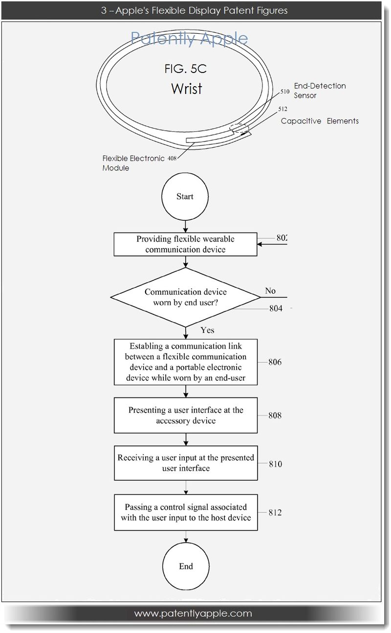 Ces brevets nous décrivent une montre conçue dans un matériaux souple, accessoire que nous appellerons pour le moment iWatch. Equipée d’un écran tactile flexible lui permettant d’épouser parfaitement les courbes du poignet de son possesseur, cette montre serait capable de communiquer avec, voir même de commander es autres appareils de la marque.