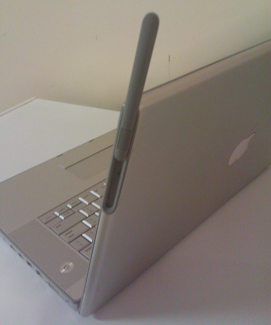 Datant de 2007, ce prototype est un modèle Santa Rosa 15 pouces équipé d’une hideuse antenne retractable, d’un module Dyanstream ANT2USB (protocole sans fil 2.4Ghz) et d’un slot SIM.
