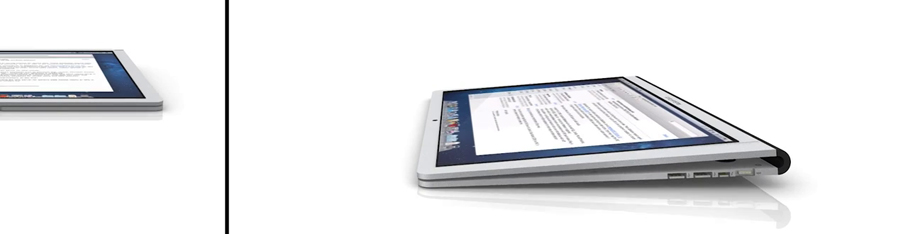 Tandis qu’un bon nombre de constructeurs ont par le passé opté pour une solution qui consiste à faire pivoter l’écran sur un axe central avant de le replier pour le passer en configuration tablette, ce concept passe d’une fonction à l’autre grace à une simple bande flexible faisant le lien entre l’écran et le reste de la machine. Pourquoi pas mais on notera tout de même qu’un tel concept donnerait du sens à une fusion entre OS-X et iOS, rapprochement qui se concrétisera un peu plus avec l’arrivé prochaine de OS-X Mountain Lion.