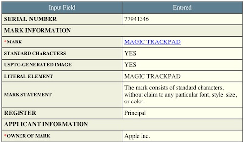 Ce petit bonus que personne n’aura vu venir répondrait au petit nom de ‘Magic TrackPad‘ (récemment déposé par Apple (voir plus bas)) et serait destiné à accompagner les claviers sans fil de la marque… Wait & See…