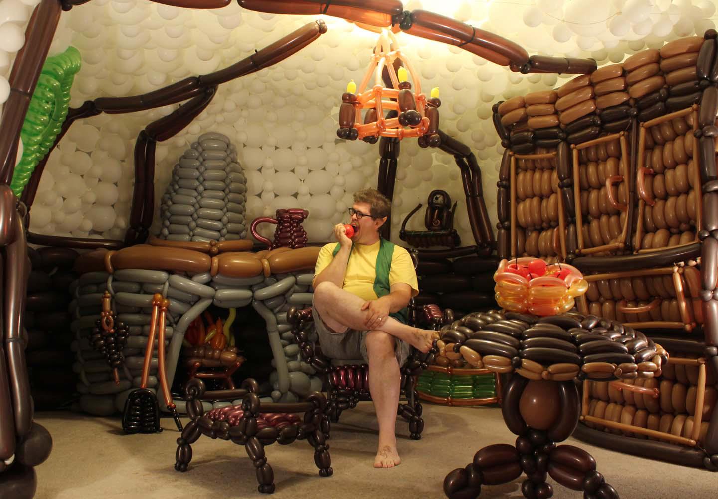 Modelés à l’échelle 1:1 soit à taille humaine, l’intérieur de cette maison et l’ensemble de ses meubles et objets de décoration ont en effet été entièrement réalisés à l’aide de ballons à sculpter. Notez au passage qu’il aura fallu pas moins de 40h de travail pour achever la petite chaumière.