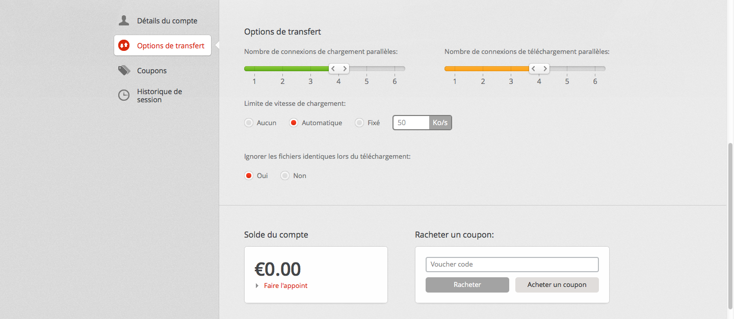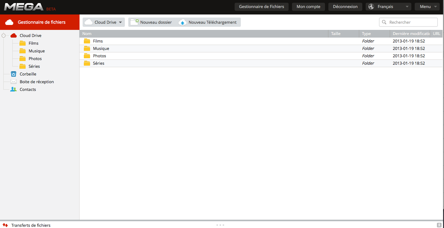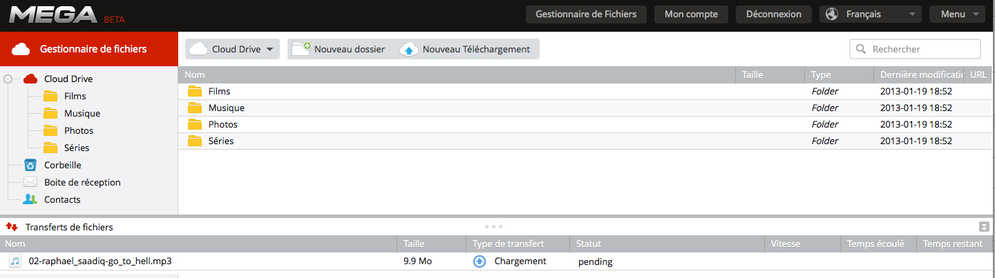 Claire et intuitive, l’interface de la plateforme se présente sous la forme d’un gestionnaire de fichiers tout ce qui a de plus traditionnel. Une colonne placée sur la gauche vous permet d’accéder à votre espace de stockage en ligne et par extension aux divers dossiers que vous aurez créé (musique, photos, films, etc…) ainsi qu’à votre corbeille.