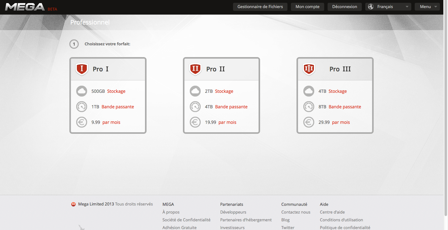 A cette offre d’appel viennent s’ajouter deux autres formules Pro proposant 500Go et 1To de bande passante, 2To et 4To de bande passante et enfin 4To d’espace de stockage et 8To de bande passante aux tarifs de 9.99€/mois, 19.99€/mois et 29.99€/mois. Bref, Mega écrase littéralement la concurrence sur les terrains de l’offre et de la tarification.