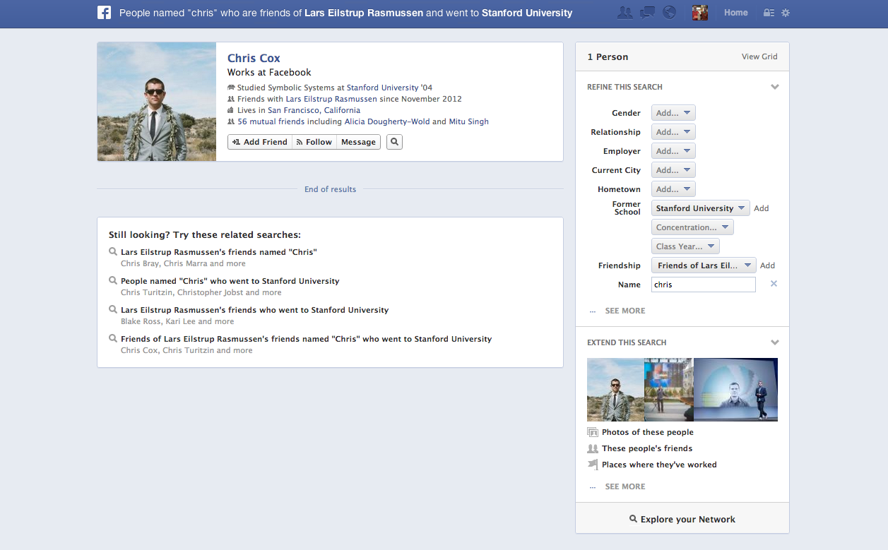 Ce moteur de recherche est également capable de répondre à des requêtes bien plus complexes en croisant de multiples données. Ainsi, vous pourrez par exemple demander à Graph Search de vous indiquer parmi vos amis prénommés Pierre, lesquels habitent à Paris et même réduire le champ de recherche en lui demandant d’exclure toutes les personnes qui ne sont pas en relation avec Paul (requête: personnes prénommés Pierre qui sont amis avec Paul et qui habitent à Paris).