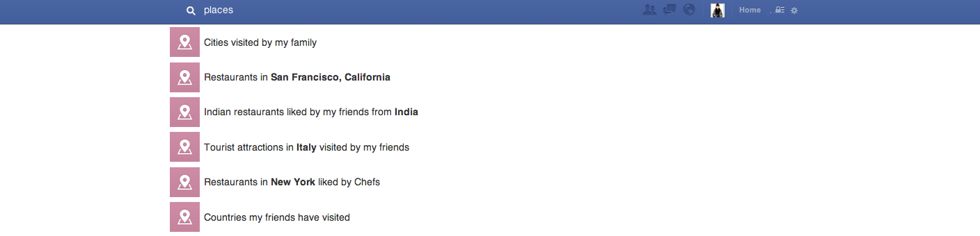 Actuellement en phase de test, Graph Search dont le champ d’action est pour le moment réduit aux pages communautaires, pages de centres d’intérêts et pages de lieux est uniquement accessible à une petite poignée de membres utilisant la version anglaise de la plateforme et ayant obtenu une invitation.
