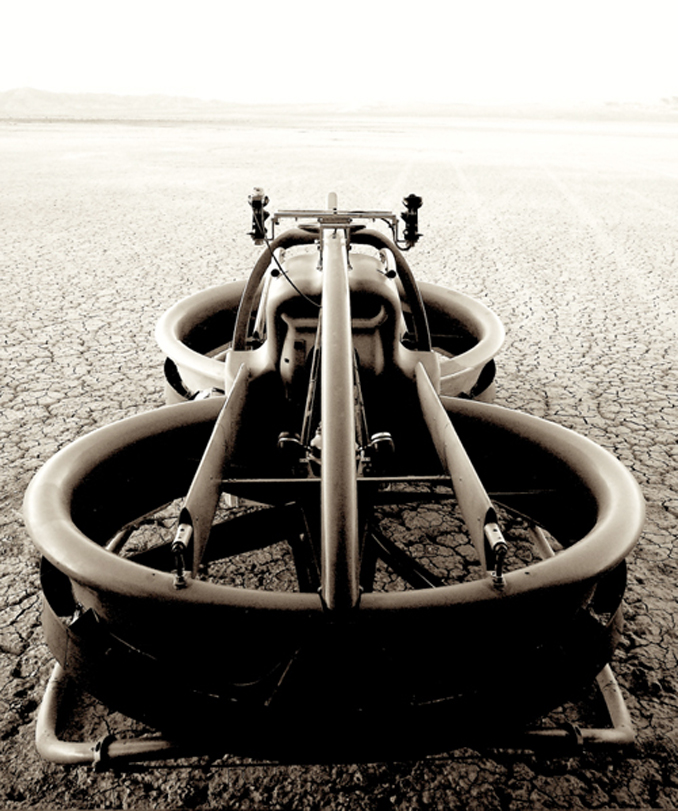Equipée de deux énormes rotors, cet espèce de moto volante aurait été conçue sur la base d’anciens travaux abandonnés dans les années 60 suite à quelques problèmes de stabilité de l’engin impossibles à régler à l’époque. Ce nouveau prototype serait pour sa part parfaitement maniable.