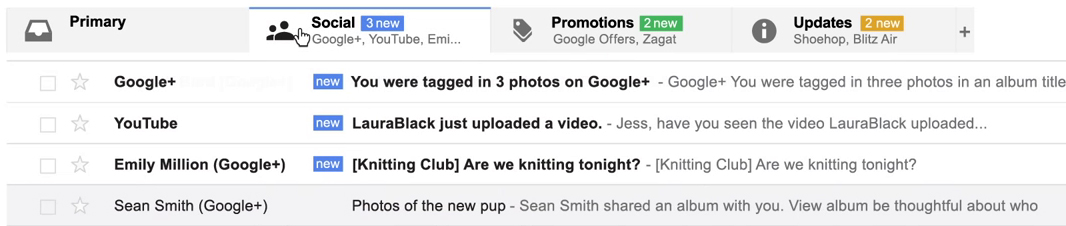 La principale nouveauté de cette mise à jour repose sur l’intégration de 5 nouveaux onglets thématiques affichés en tête de votre boîte de réception, onglets donnant accès à vos emails préalablement filtrés par Gmail en fonction de leur contexte.