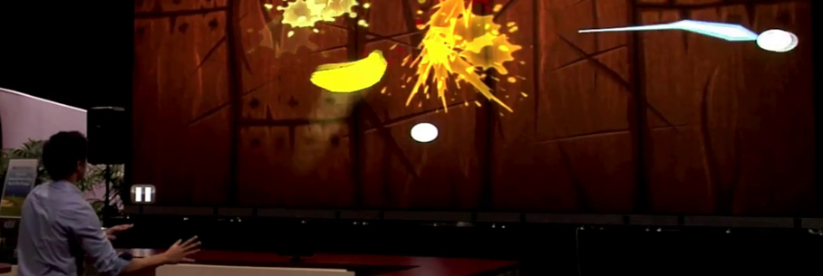 Prenez un nouvel iPad et un capteur de mouvements Kinect, faites en sorte que le second vous permette d’interagir avec le premier que vous aurez préalablement branché sur un gigantesque écran LED de 7.30m de large sur 3.70m de haut pour une épaisseur de 3.5mm et lancez un jeu tel que «Fruit Ninja». Vous pouvez aussi vous contenter de découvrir le résultat obtenu via la démonstration qui suit…