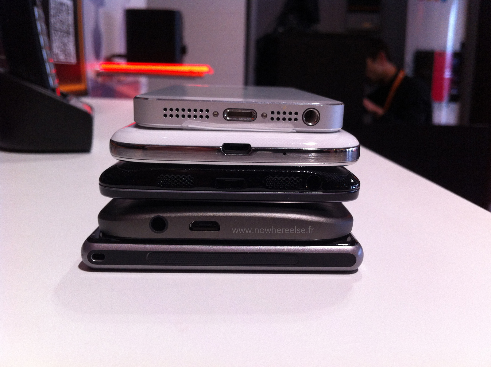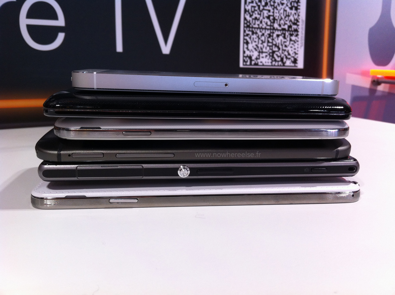 Avant toute chose et parce que je n’ai pas pour habitude de vous mentir, sachez que l’appareil en ma possession n’est pas un authentique exemplaire du HTC M8 mais un modèle d’exposition. Modèle fictif qui n’en reste pas moins identique au modèle original et que j’ai photographié pour l’occasion aux côtés de certaines références du marché que sont l’iPhone 5s d’Apple, les Galaxy S4 et Note 3 de Samsung, le XPERIA Z1 de SONY et le LG G2.