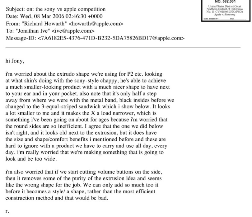 Au cas ou cette preuve ne serait pas suffisamment accablante, Samsung joint à cette pièce à conviction un email (ci-contre) adressé en 2006 à Jonathan Ive par Richard Howarth dans lequel ce dernier suggère clairement à son confrère de s’inspirer de la vision de SONY dans le cadre de la conception de l’iPhone.