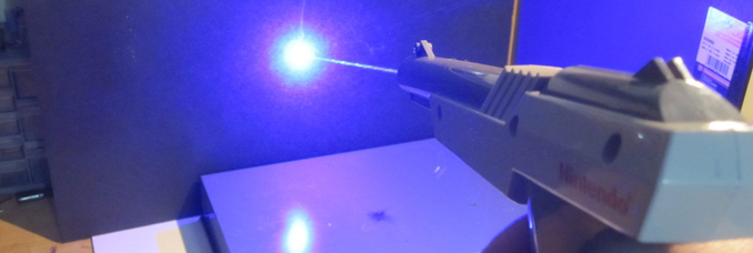 Les petits bricoleurs de chez North Street Labs ont transformé un bon vieux pistolet optique Nintendo Zapper en un véritable pistolet laser et ce en l’équipant d’une diode M140 de 445nm de longueur d’onde (l’équivalent d’une diode de lecteur Blu-Ray) diffusant un rayon laser d’une puissance de 2W soit 400 fois plus qu’un pointeur laser standard. Un gadget à ne pas mettre entre toutes les mains…