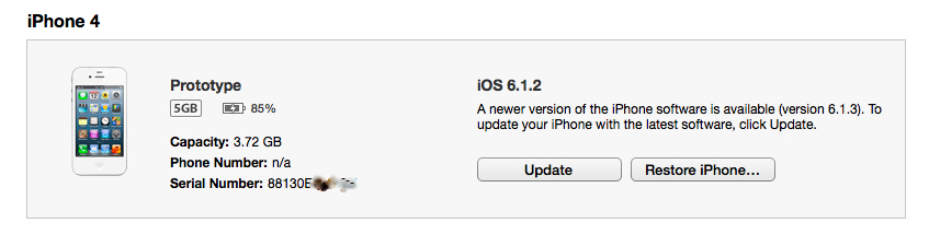 Curieusement et comme le précise son propriétaire, iTunes qui identifie bien cet iPhone comme un prototype d’iPhone 4 détecte non pas 4Go de capacité de stockage initiale mais 5Go. Allez comprendre pourquoi…