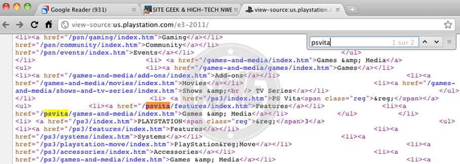 En consultant le code source de la page créée spécialement par SONY à l’occasion du Salon de l’E3 vous pourrez en effet vous apercevoir que cette mention apparaît à plusieurs reprises dans le code HTML de la page sous la forme «psvita» ou «PS Vita».