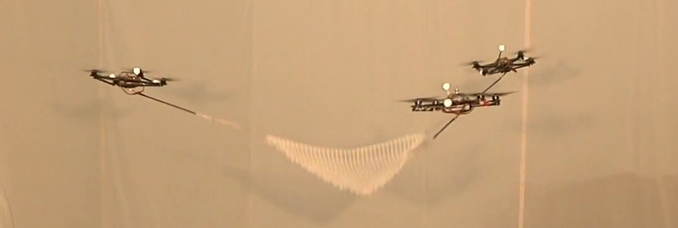 En mars 2011, l’équipe travaillant sur le projet Flying Machine Arena nous démontrait les capacités de ces drones autonomes qui à l’époque étaient déja capables de jouer entre eux. Désormais, ces mêmes machines sont en mesure de travailler en symbiose dans le but d’effectuer diverses tâches.