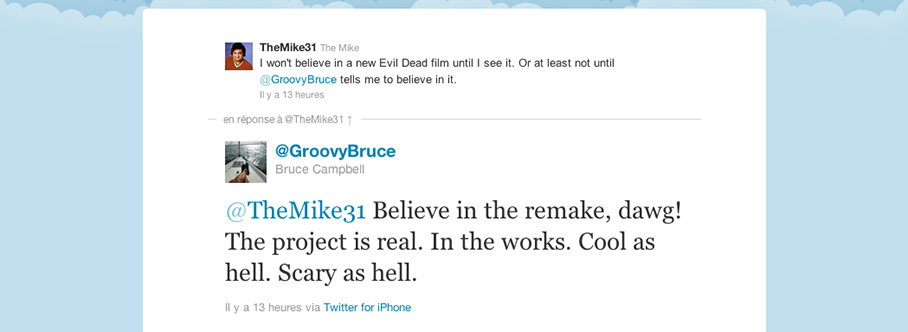 Alors, énième relent d’une rumeur qui ne tiendra jamais ses promesses ou rêve d’amateur du genre étant sur le point de devenir réalité? Bruce Campbell qui est comme par hasard à nouveau actif sur Twitter depuis le 7 juillet dernier a en tout cas rétorqué à un fan mettant cette information en doute qu’un remake (et non un 4ème épisode) est bel et bien au programme… Si seulement…