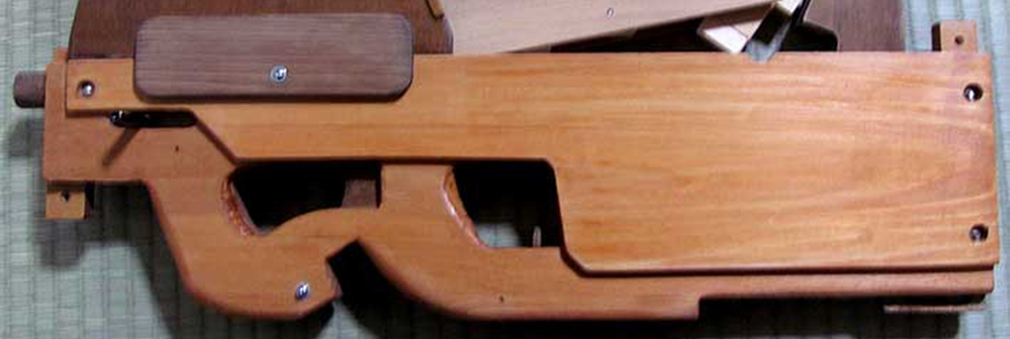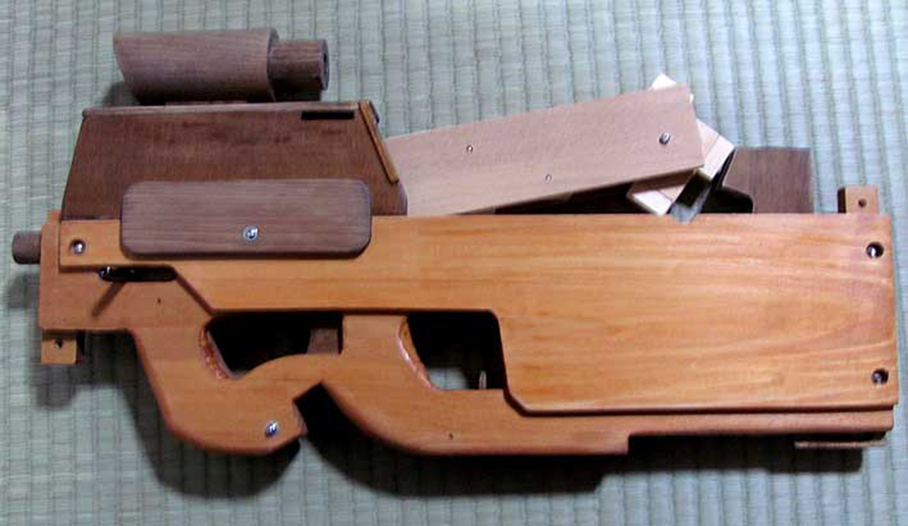 Esthétiquement très proche du pistolet mitrailleur original conçu par la société belge FN Herstal, voici une incroyable réplique en bois fonctionnelle du FN-P90 qui, contrairement à son modèle qui tire des balles de 5.7x28mm SS190, est chargée avec des élastiques…
