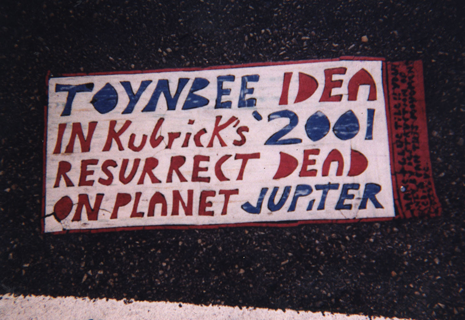 «Toynbee idea in Kubrick’s 2001 resurrect dead on planet Jupiter»… Tombé une première fois et par hasard sur cet étrange message inscrit sur une plaque de lino collée en pleine rue à même le sol, l’artiste Justin Duerr s’est au fil du temps rendu compte que ce message codé était reproduit à de multiples reprises à travers toute l’Amérique. Poussé par sa curiosité, le jeune homme s’est alors mis en tête de percer le mystère et tenter découvrir la signification des tuiles dites de «Toynbee» (NDLR: du nom de l’historien Arnold J. Toynbee) faisant référence au film «2001 : l’Odyssée de l’Epsace» de Kubrick…