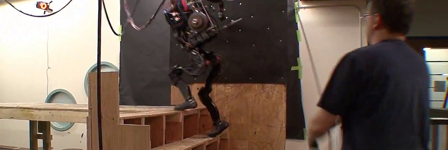 Déja bien assez flippant à mon goût dans sa version précédente, le robot bipède Petman développé par les savants fous de chez Boston Dynamics pour le compte de la DARPA est désormais capable de gravir des marches bref, de vous poursuivre même si vous tentiez de lui échapper en empruntant des escaliers… Ça donne froid dans le dos…