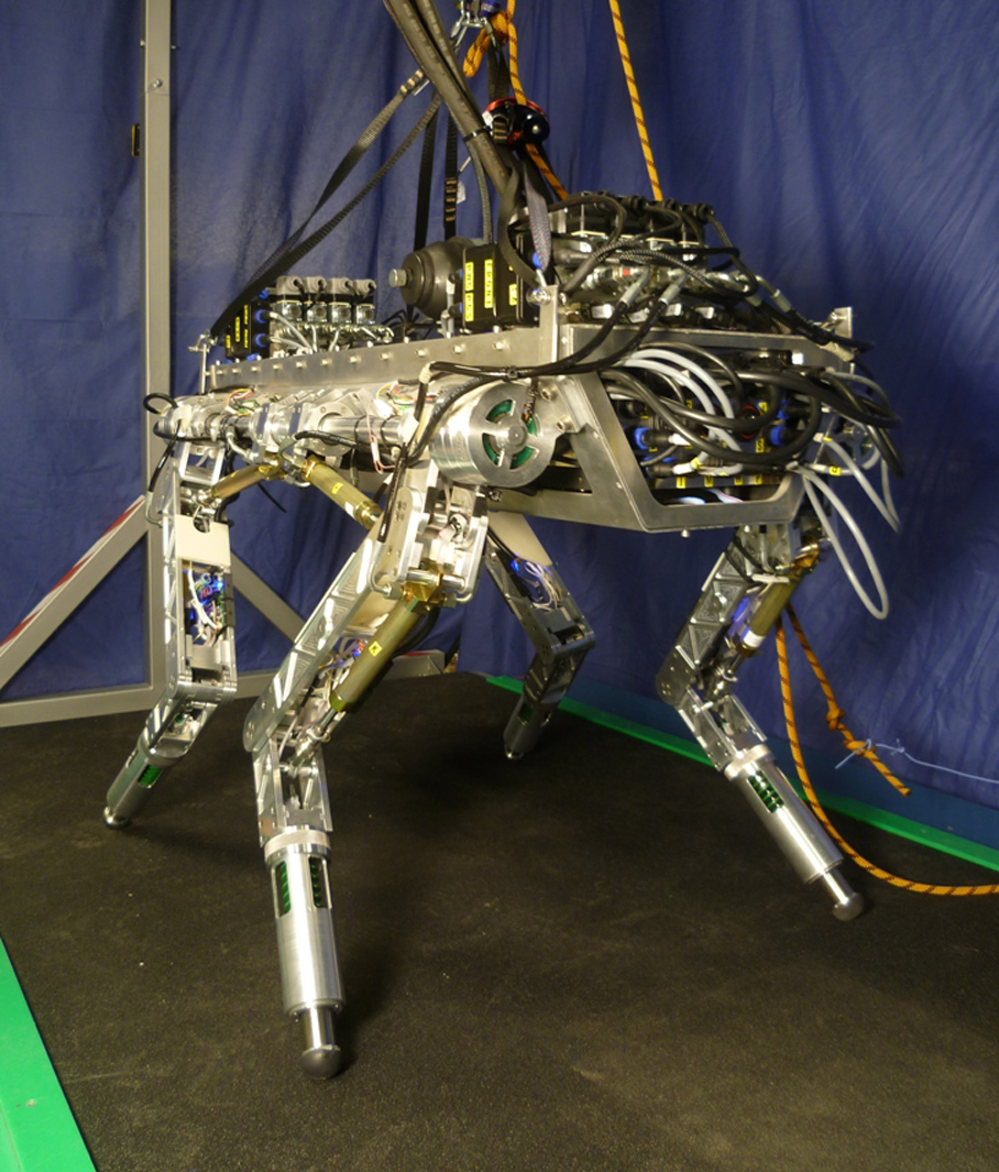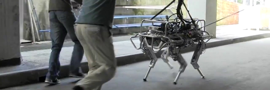 Conçu par le département robotique de l’Institut italien de technologie (ITT), ce robot baptisé HyQ est motorisé par 8 vérins hydrauliques couplés à 4 moteurs électriques, mesure 1m de long sur 1m de haut pour un poids de 70kg, est capable de traverser des terrains accidentés et de se déplacer au trot à la vitesse maximale de 4m/sc. De quoi alimenter vos cauchemars cybernétiques…