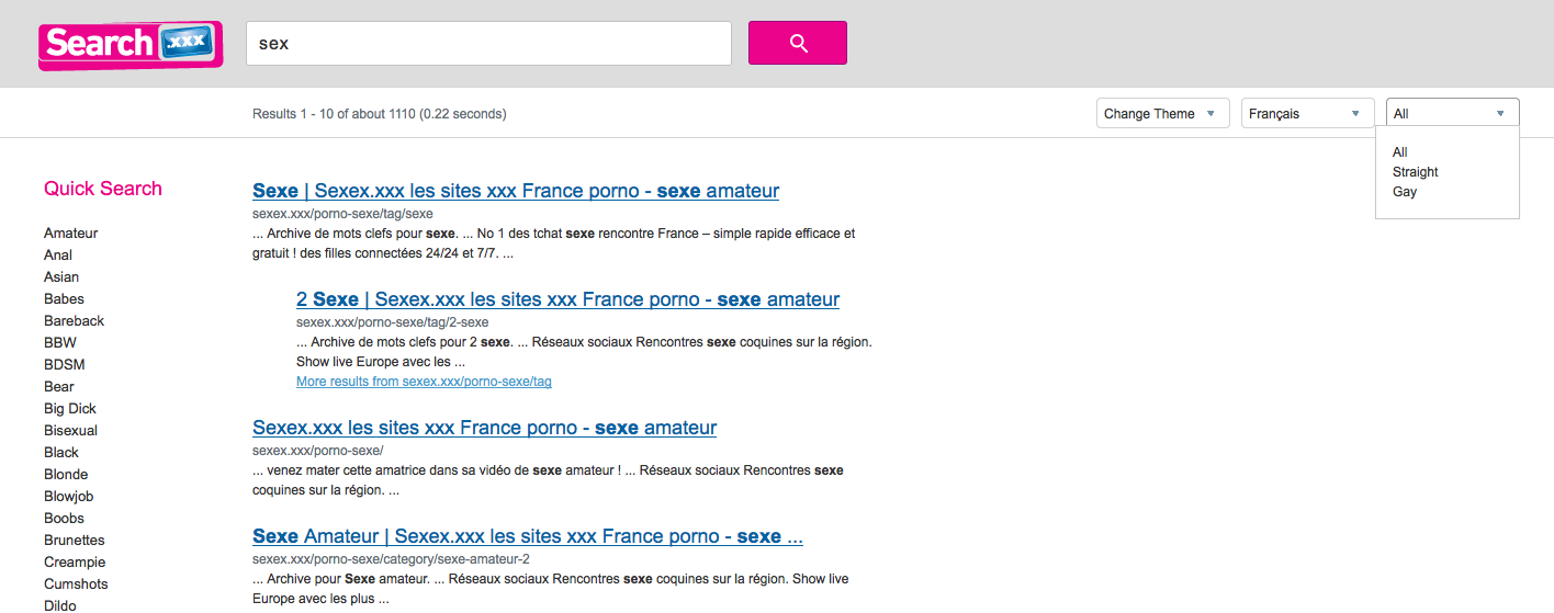 A l’image du plus célèbre moteur de recherche de la planète qui n’est autre que Google Search, Search.xxx livre ses résultats au sein d’une interface minimaliste disponible dans deux version light et dark. Offrant pour le moment deux filtres vous permettant pour l’un d’affiner vos recherches en fonction de votre langue (19 langues actuellement disponibles) et de filtrer les résultats en fonction de votre orientation sexuelle (hétéro ou homosexuel) pour l’autre, Search.xxx affiche les résultats obtenus sans fioritures mais surtout sans publicité (pour le moment tout du moins…).