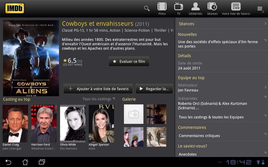 IMDb est l’un des plus gros sites Internet consacré au cinéma ; pour faire simple, c’est un peu le Allociné américain. Sauf qu’à la différence de son homologue français qui ne propose sur Android qu’une application smartphone, IMDb s’est attelé à développer une véritable application tablette, entièrement traduite en français !
