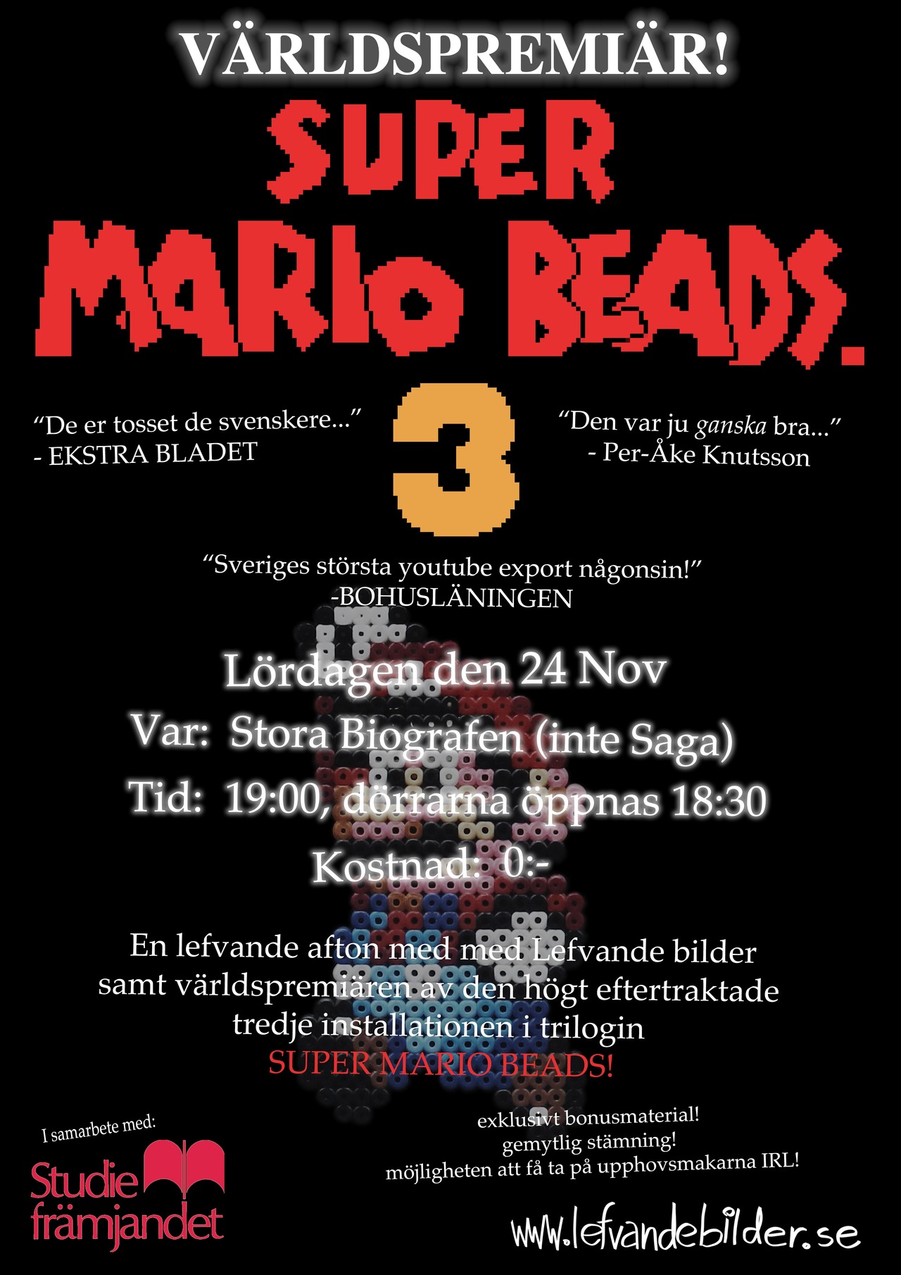 Le 17 aout 2011, les gars du studio suédois Lefvande bilder diffusaient Super Mario Beads, leur première création réalisée en stop-motion vidéo sur le thème des jeux de la série des Super Mario Bros. Deux mois plus tard, Marcus et Hannes Knutsson récidivaient en réalisant une suite naturellement intitulée Super Mario Beads 2. Aujourd’hui, les deux frangins sont de retour avec un remarquable troisième épisode dont, je vous le donne en mille, le titre n’est autre que Super Mario Beads 3… Enjoy !