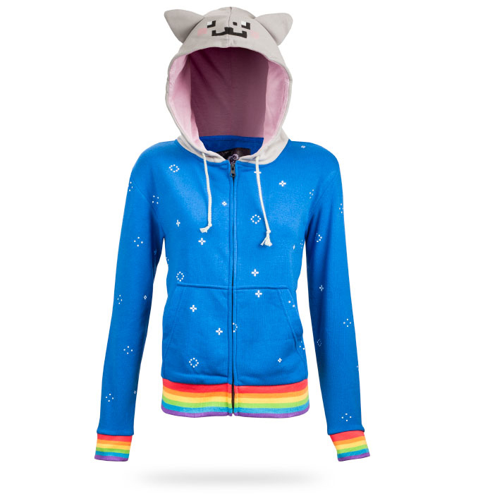 Juste une petite note pour signaler aux inconditionnel(le)s du Nyan Cat qui n’ont pas peur de ce faire remarquer bref, pour ceux et celles qui n’aiment pas passer inaperçus, qu’un sweat ou plus exactement une veste à capuche avec oreilles de chat imprimée aux couleurs du célèbre Mème est désormais disponible au tarif de 49.99$ du côté de chez ThinkGeek.