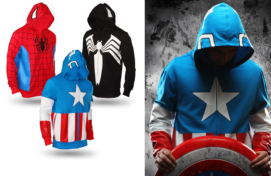 Ces sweats aux couleurs des Super Héros Marvel «Captain America», «Spiderman» et «Black Spiderman» sont dispo chez ThinkGeek au tarif de 49.99$ pièce.