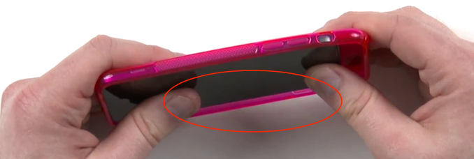 Dans la vidéo qui nous intéresse, Hilsenteger clame à de multiples reprises que l’épaisseur de cette coque en silicone est, je cite, exactement identique à celle de l’iPod Touch de cinquième génération. Ce qui n’est visiblement pas le cas…