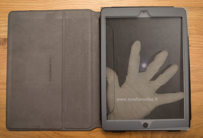Dans le cas présent, l’iPad vient en effet se glisser dans cette pochette dont la partie censée maintenir l’appareil nous informe que les bordures qui encadrent l’écran de l’iPad 5 seront plus fines que celles de l’actuel iPad 4 soit 1cm d’épaisseur pour les bordures latérales de la pochette contre 2cm pour celles de l’iPad 4.