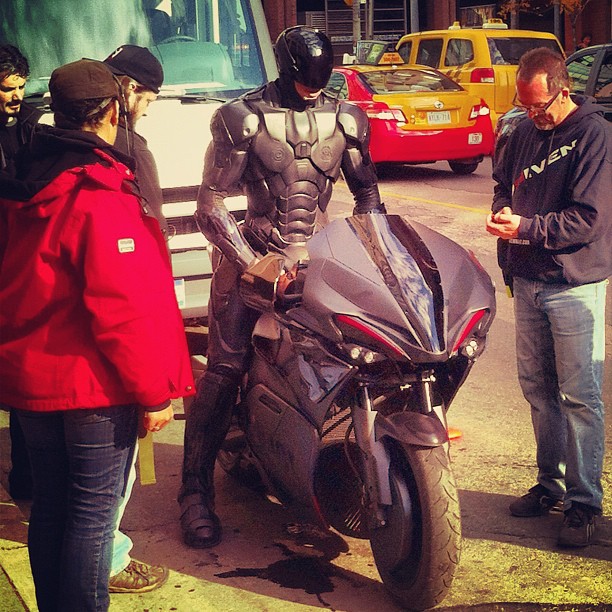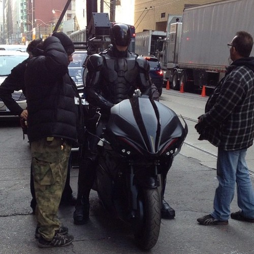 Aujourd’hui, une nouvelle vidéo nous offre un point de vue concret sur la monture mécanique au guidon de laquelle le Robocop de José Padilha se déplace dans les rues de la ville de Toronto ou se déroule actuellement le tournage de ce remake dont la date de sortie a récemment été repoussée au 7 février 2014. Je profite de cet article pour vous glisser également quelques nouvelles photos.