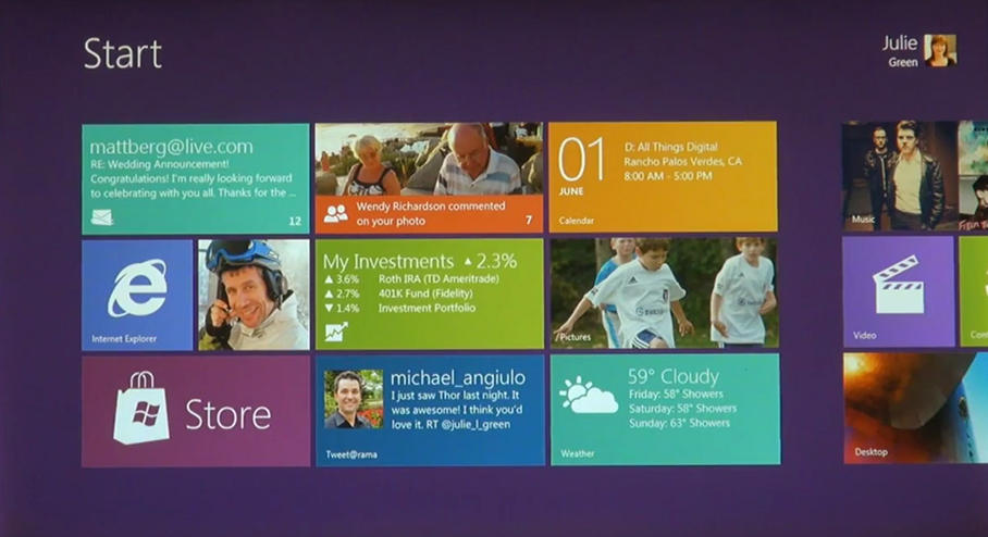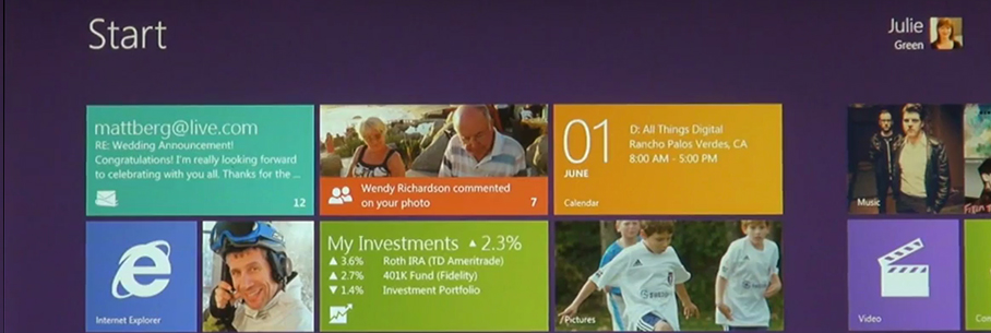 Clairement inspirée par l’OS mobile maison «WP7», l’interface de type «Metro» adaptée à «Windows 8» étonne autant qu’elle déroute… Le bon vieux bureau et ses raccourcis laissent en effet place à un alignement d’applications (Javascript et HTML5) présentées sous forme de Widgets (tuiles) sur lesquels sont affichées diverses informations relatives aux contenus accessibles depuis ces emplacements. Ceux et celles qui possèdent ou ont eu l’occasion de tester un mobile sous «Windows Phone 7» sont déja plus ou moins familiarisés avec ce type d’environnement.